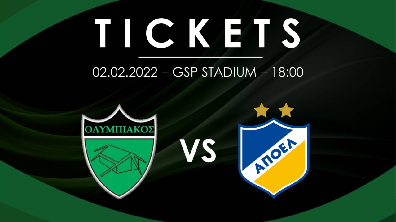 Ο Ολυμπιακός Λευκωσίας ενημερώνει ότι έχει ξεκινήσει η διάθεση εισιτηρίων για τον επαναληπτικό εντός έδρας αγώνα της ομάδας μας για την Β' Φάση Κυπέλλου, με αντίπαλο την ομάδα του ΑΠΟΕΛ στο Στάδιο Γ.Σ.Π (Τετάρτη 02.02.2022 - 18:00).