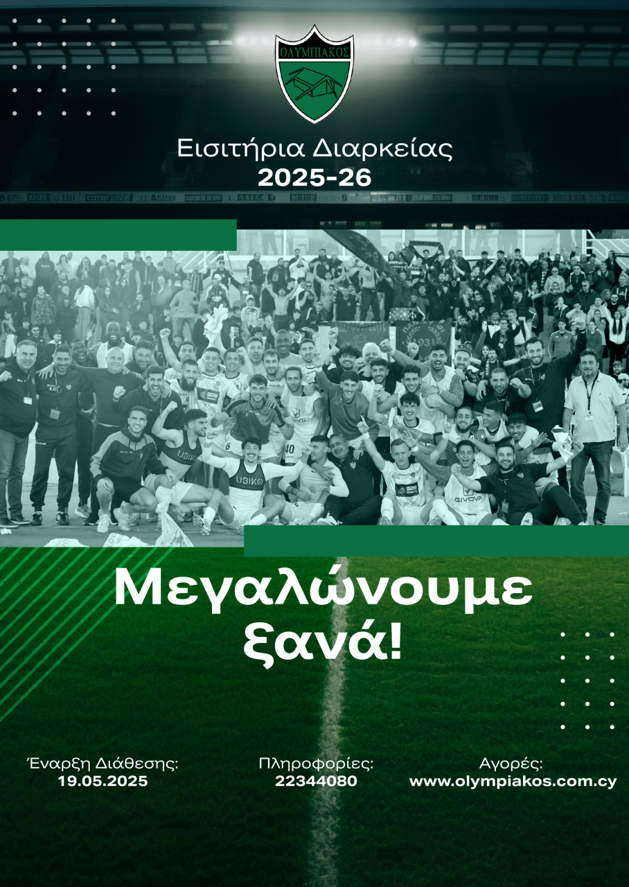 ΟΛΥΜΠΙΑΚΕ, η ομάδα μας επιστρέφει δυναμικά στην Α’ Κατηγορία και στο ΓΣΠ! Η δύναμή της ομάδας είσαι εσύ – ο ΚΟΣΜΟΣ του ΟΛΥΜΠΙΑΚΟΥ. Στήριξε έμπρακτα την προσπάθεια της ομάδας μας με προμήθεια εισιτηρίου διαρκείας και στήριξε την ομάδα σε κάθε αγώνα!