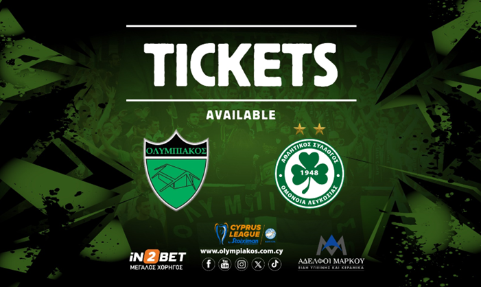 Ο Ολυμπιακός Λευκωσίας ανακοινώνει την έναρξη της προπώλησης των εισιτηρίων για τον εντός έδρας αγώνα της 13ης αγωνιστικής του Πρωταθλήματος Cyprus League by Stoiximan 2025-2026, απέναντι στην Ομόνοια Λευκωσίας, που θα διεξαχθεί στο Στάδιο ΓΣΠ, το Σάββατο 06 Δεκεμβρίου 2025, στις 17:00.